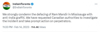 वाणिज्य दूतावास ने ट्वीट किया, हम मिसिसॉगा में राम मंदिर को भारत विरोधी चित्रों से विरूपित करने की कड़ी निंदा करते हैं। हमने कनाडा के अधिकारियों से घटना की जांच करने और अपराधियों पर त्वरित कार्रवाई करने का अनुरोध किया है।
