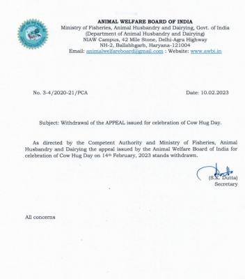 14 फरवरी को दुनिया भर में वेलेंटाइन डे के रूप में मनाया जाता है। एक नोटिस में बोर्ड के सचिव एस.के. दत्ता ने कहा, सक्षम प्राधिकारी और मत्स्य पालन, पशुपालन और डेयरी मंत्रालय के निर्देश के अनुसार, 14 फरवरी को काउ हग डे मनाने के लिए भारतीय पशु कल्याण बोर्ड द्वारा जारी की गई अपील वापस ले ली जाती है।