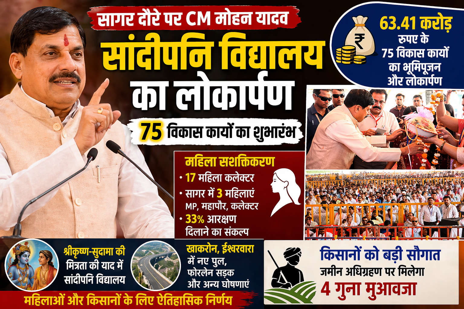 कार्यक्रम की सबसे बड़ी उपलब्धि रही सांदीपनि विद्यालय का लोकार्पण। मुख्यमंत्री ने विद्यालय परिसर में पहुंचकर विद्यार्थियों से सीधा संवाद किया और बोर्ड परीक्षा की मेरिट सूची में स्थान पाने वाले होनहार छात्र-छात्राओं को मंच पर सम्मानित किया।
