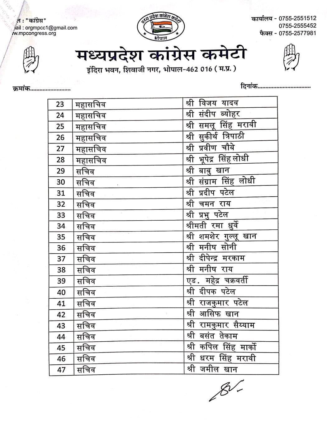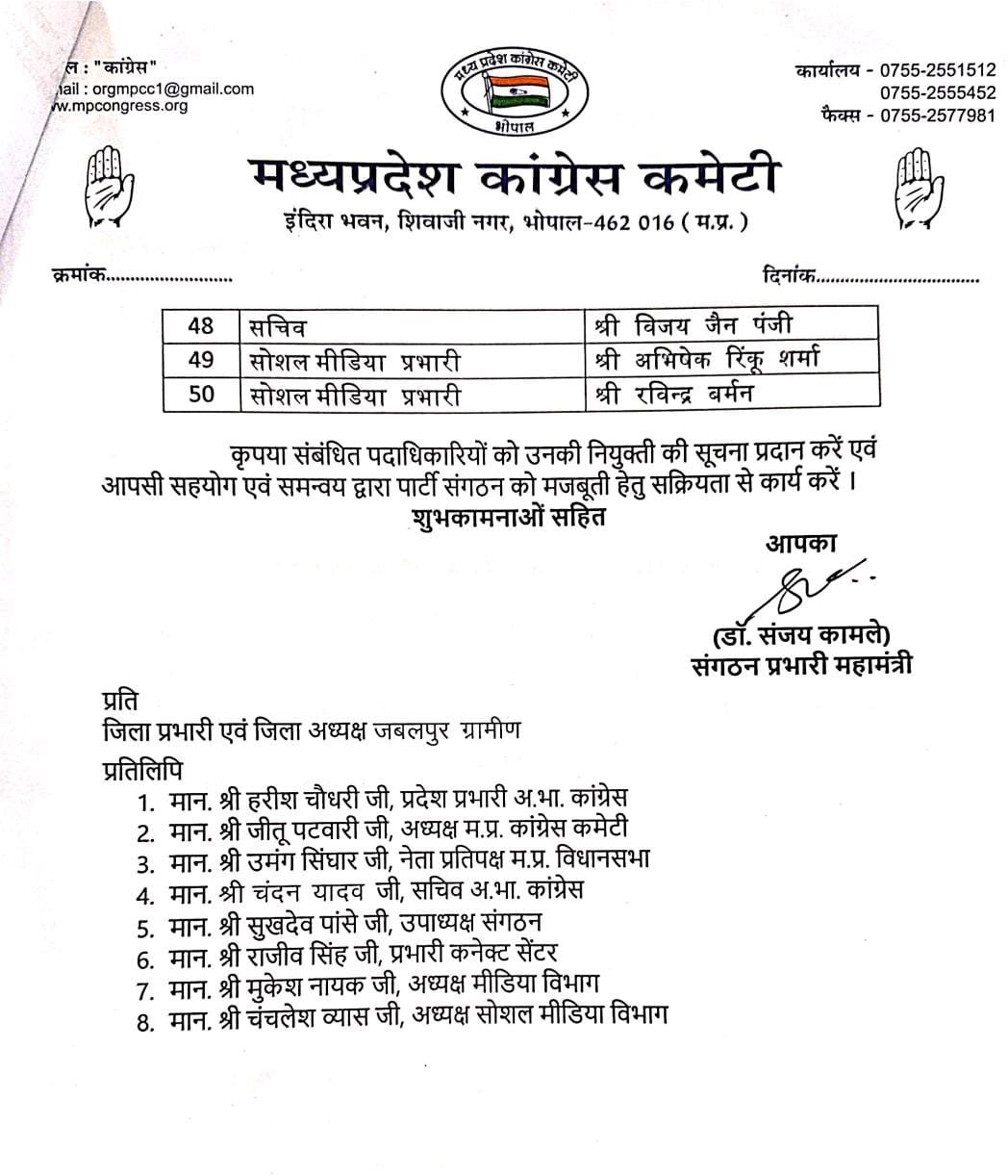 इंदिरा भवन, शिवाजी नगर, भोपाल स्थित प्रदेश कांग्रेस कार्यालय से जारी पत्र में बताया गया कि जिला कांग्रेस कमेटी जबलपुर ग्रामीण के अध्यक्ष, उपाध्यक्ष, महासचिव, सचिव और सोशल मीडिया प्रभारियों सहित कुल 50 पदाधिकारियों की नियुक्ति को मंजूरी दी गई है।