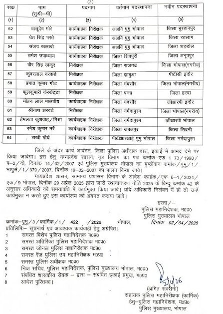 भोपाल. मध्य प्रदेश पुलिस महकमे में गुरुवार देर रात एक बड़ा प्रशासनिक फेरबदल देखने को मिला है. पुलिस मुख्यालय (PHQ) ने राज्य के विभिन्न जिलों में तैनात 64 निरीक्षकों (Inspectors) के तबादला आदेश जारी किए हैं. 2 अप्रैल की देर शाम जारी इस सूची ने विभाग में हलचल तेज कर दी है.