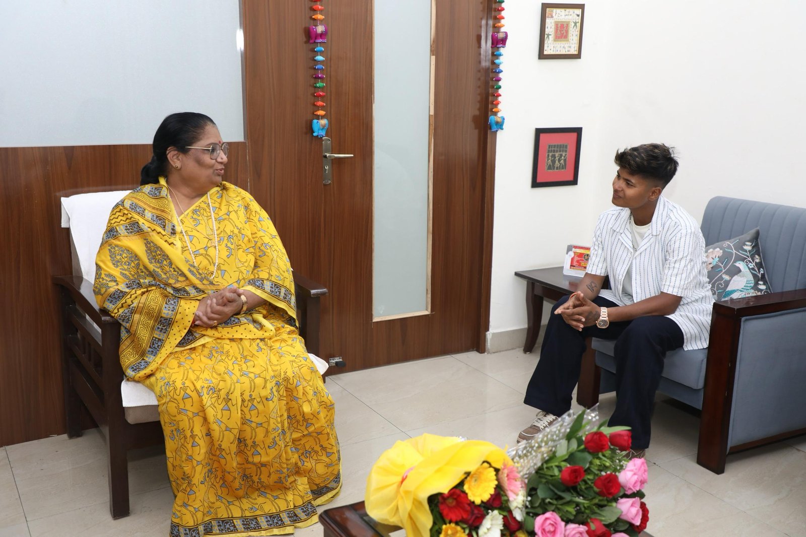 भोपाल। मध्यप्रदेश की उभरती अंतर्राष्ट्रीय महिला क्रिकेटर और भारतीय क्रिकेट टीम की सदस्य क्रांति गौड़ ने आज अपने भोपाल स्थित निवास पर महिला एवं बाल विकास मंत्री निर्मला भूरिया से सौजन्य भेंट की। इस अवसर पर खेलों के विकास, विशेषकर महिला क्रिकेट को बढ़ावा देने, ग्रामीण क्षेत्रों की प्रतिभाओं को प्रोत्साहित करने और युवाओं को खेलों की ओर आकर्षित करने पर विस्तृत चर्चा हुई।